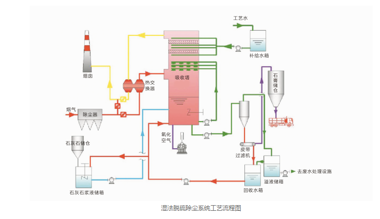 將石灰石粉加水制成漿液作為吸收劑泵入吸收塔與煙氣充分接觸混合,煙氣中的二氧化硫與漿液中的碳酸鈣以及從塔下部鼓入的空氣進(jìn)行氧化反應(yīng)生成硫酸鈣,硫酸鈣達(dá)到一定飽和度后,結(jié)晶形成二水石膏。經(jīng)吸收塔排出的石膏漿液經(jīng)濃縮、脫水,使其含水量小于10%,然后用輸送機(jī)送至石膏貯倉堆放,脫硫后的煙氣經(jīng)過除霧器除去霧滴,再經(jīng)過換熱器加熱升溫后,由煙囪排入大氣。由于吸收塔內(nèi)吸收劑漿液通過循環(huán)泵反復(fù)循環(huán)與煙氣接觸,吸收劑利用率很高,鈣硫比較低,脫硫效率可大于99%。
