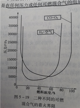 圖5-19給出了兩種不同可燃混合氣的著火(點燃)濃度界限。在理論文獻中,表示著火范圍的濃度界限都是用壓力(或溫度)對可燃混合氣組成的關系曲線來描述的。這些圖形的曲線通常是不對稱的,或偏向左,或偏向右。從圖5-19的曲線中可以看出:隨著壓力的下降,著火范圍變窄,存在著一個*壓力。低于這個壓力,則不論可燃混合氣的組成如何,都無法使其點燃。這時,著火濃度的上下界限趨近一致。