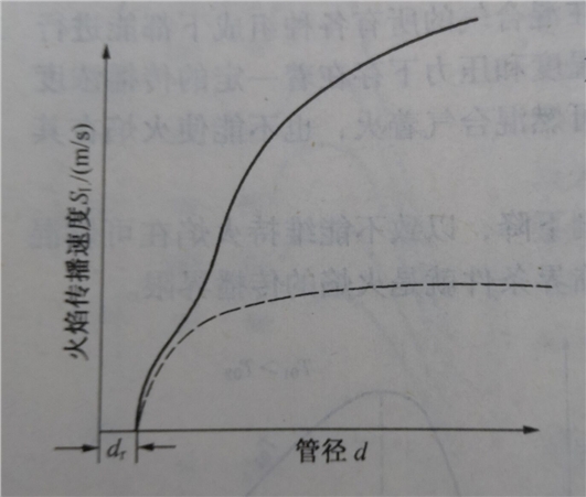 火焰在管子中傳播時,管徑的大小對火焰?zhèn)鞑ソ缦抟灿泻艽笥绊憽.?dāng)管徑減小時,因?yàn)閷鼙诘纳嵯鄬υ龃螅鹧鎮(zhèn)鞑ニ俣葴p小。當(dāng)管徑小到某一很 限值時,向管壁的散熱損失可增大到使火焰無法傳播,這時的管徑就稱為臨界直徑或淬熄直徑(淬熄距離),見圖6-17。淬熄直徑在工程上具有很實(shí)用的意義,例如利用孔徑小于淬熄直徑的金屬網(wǎng)來制止火焰的通過,這是*常用的防止回火的措施。