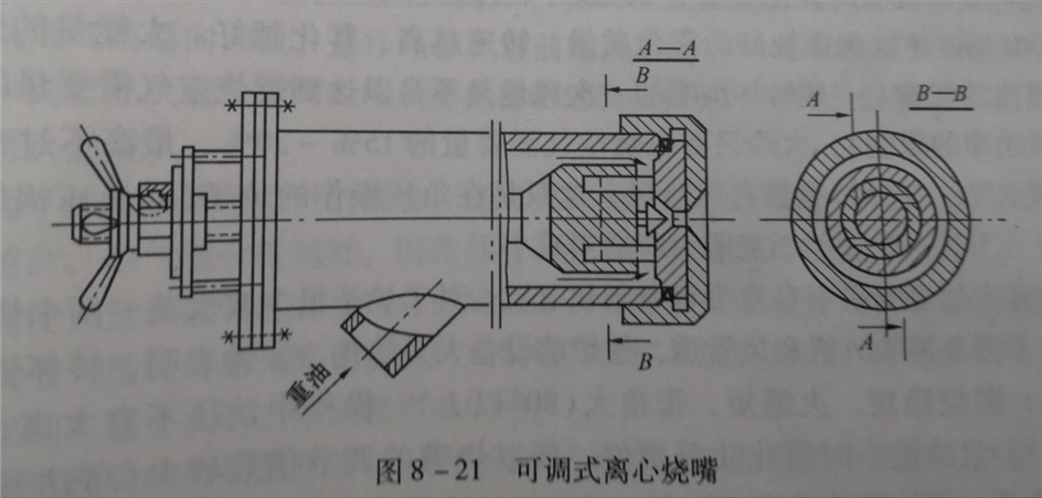另一種保持霧化質量的調節方案是采用帶針閥的可調式離心燒嘴,如圖8-21所示。這種燒嘴是用操作手柄使針閥前后移動,通過改變油噴口的有效流出斷面來調節燒嘴的負荷。該燒嘴的調節倍數可達2~3。測定結果表明,采用可調式離心燒嘴,可以在調節燒嘴負荷時,保證霧化質量基本不變;相反,采用簡單的、不可調的離心式燒嘴,當負荷變化時,顆粒平均直徑將顯著增加,霧化質量明顯變壞。因此,要求調節負荷的燒嘴,需選用適當的調節方案,以保證良好的霧化效果。