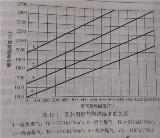 空氣和燃氣的預熱溫度越高,帶入爐內的物理熱越多,燃氣的理論燃燒溫度越高。這一關系可用圖13-1明顯地表示出來。由圖可知,將空氣預熱到600~800℃時燃燒高爐煤氣,與空氣不預熱時燃燒Hl=8374kj/Nm