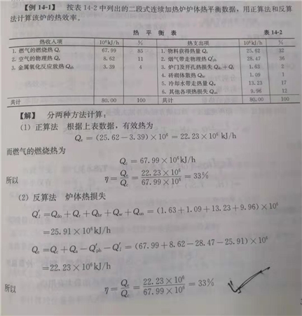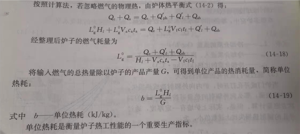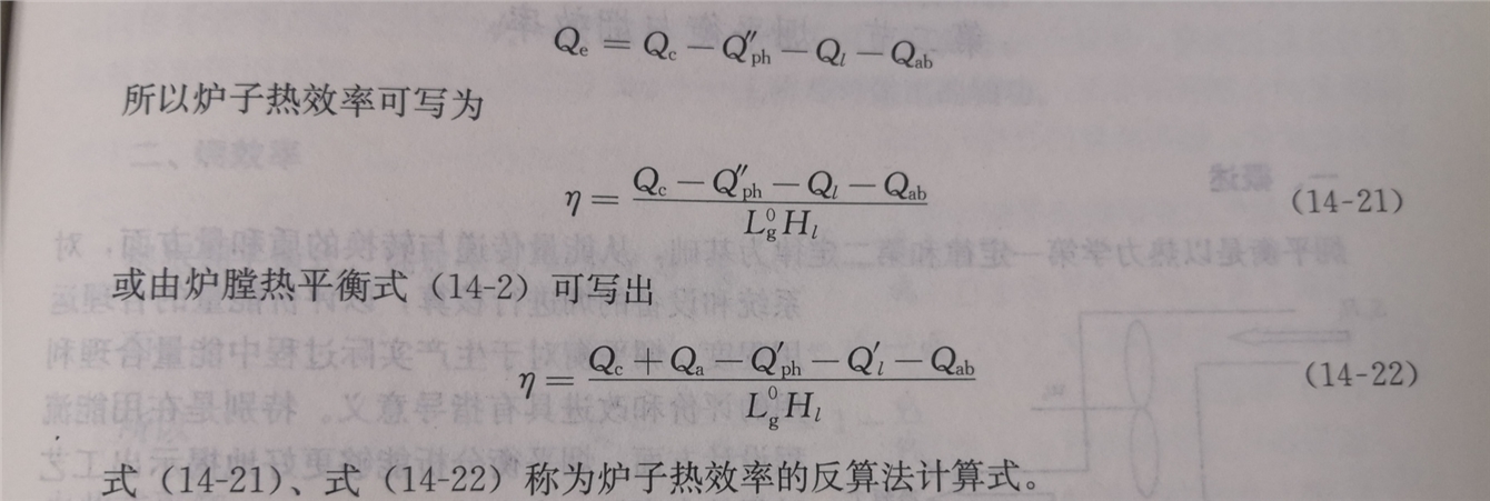在測試工作中,只要測出爐子的燃氣用量Lg、燃氣的低熱值Hl以及物料的有效利用熱量Qe,即可算出爐子的熱效率。這是一種常用的、也是較準確的測定爐子熱效率的方法,稱為直接計算法(正算法)。?需指出,直接計算法只能求得爐子的熱效率,但不可能用來研究和分析影響熱效率的各種因素,以尋求提高熱效率的途徑。為此,在實際測試過程中,往往先測出爐子的各項熱損失,反過來計算爐子的熱效率,這種方法稱為反算法。將熱效率公式改寫,忽略燃氣、空氣的物理熱時,由爐子熱平衡式(14-4)得: